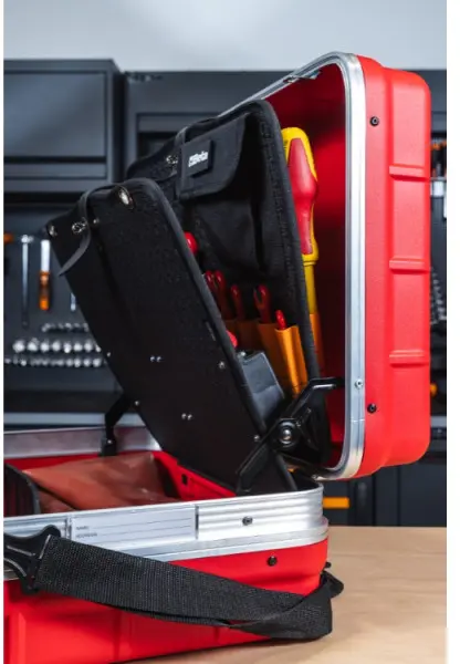 Além de ferramentas manuais, o trabalho em veículos híbridos e elétricos exige atenção especial à segurança. Por este motivo, a mala de ferramentas 2029 inclui luvas isoladas, sinais de alerta de perigo e um aparelho de teste combinado para medição de voltagem e continuidade.