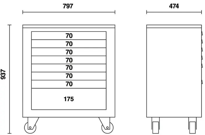 8 gavetas (588×367 mm), com guias telescópicas de esferas