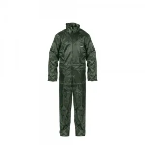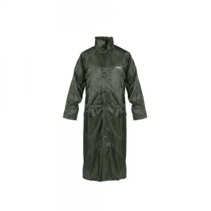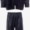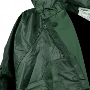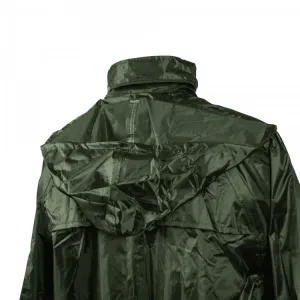 Conjunto impermeável, com revestimento em PU, composto por casaco com fecho de correr, capuz dobrável na gola, cordão na parte inferior, mangas a direito ajustável com botão de pressão, rede interna nas costas, bolsos na frente com paleta de fecho.