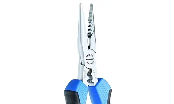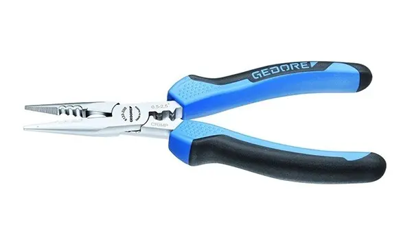 Corpo em aço Gedore-Vanadium e empunhadura em polímero anti-chamas nas cores azul e preto, padrão Gedore. Acabamento niquelado e cromado. Empunhadura ergonômica e antideslizante, com abas protetoras arredondadas para maior conforto e segurança. Produzida por injeção, propiciando isolação até 1000 V, conforme norma NBR 9699, submetida à ensaios de: impacto, tensão elétrica, aderência, inflamabilidade e pressão/penetração. Utilizar este Alicate isolado, em tensão máxima de 1000 V em corrente alternada e 1500 V em corrente contínua, conforme norma NBR 9699. Atende com segurança a norma regulamentadora NR 10 – Segurança em Instalações e Serviços em Eletricidade, possui certificado de isolação. Tratamento térmico total e corte temperado por indução com dureza de 62 – 64 HRC. Alicate com bico semirredono, reto, ponta fina, com dentes finos e em paralelo, que permite puxar, segurrar, cortar, desencapar, amassar e crimpar fios e cabos. Indicado para corte de arame com dureza média, diâmetro máximo de Ø 1,6 mm e com resistência à tração 1600 N/mm². Permite desencapar cabos com seção de 0,5; 1,5 e 2,5 mm² , amassar cabos com seção de 1,0 – 2,5 mm² e crimpar terminais com seção de 0,5 – 2,5 mm². Para utilização em mecânica e eletrônica.