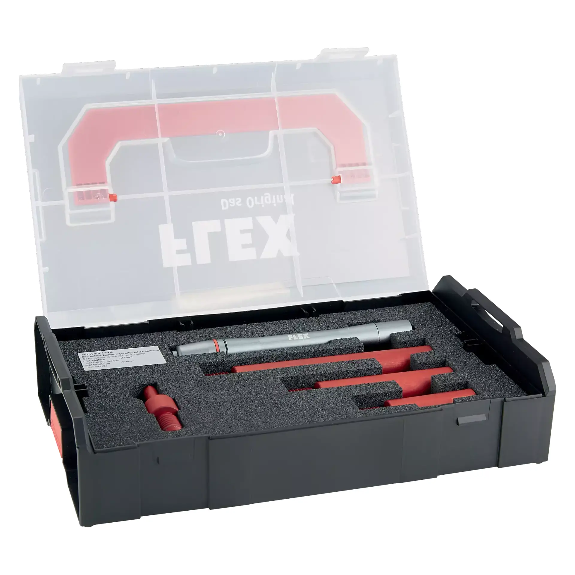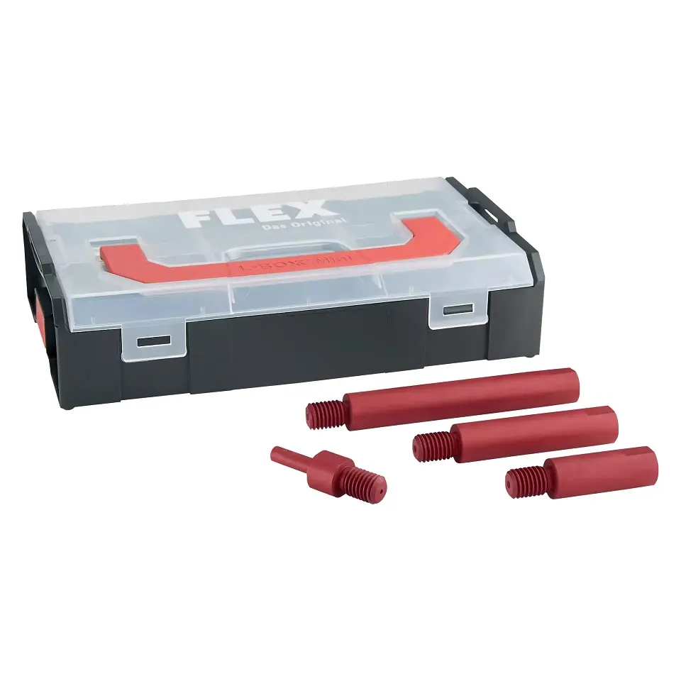 Os extensores do polidor rotativo para trabalhar com superfícies estreitas e de difícil acesso, como espelhos externos, spoilers, para-choques, etc. Consiste em três extensores M14 em alumínio anodizado de 50 mm, 80 mm e 120 mm, além de um adaptador M14 para chaves de fenda alimentadas por bateria. Ø do eixo 19 mm, superfície da chave EC 17, placa de suporte Ø 75 mm, Ø max. elemento polimento 80 mm. Embalado na estojo Mini L-BOXX® prático com enchimento e compartimento separado para a luz LED Swirl Finder SF 150-P (não incluída no volume de entrega).