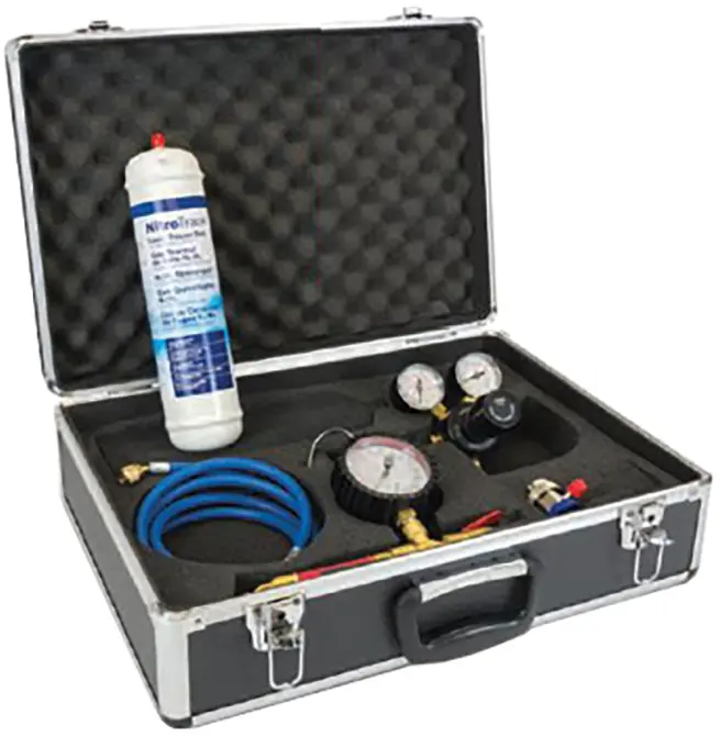 – Inclui: regulador de pressão de 300bar entrada, 10bar de saída, mangueira de 90cm, manómetro de pressão de N2, botija de gás Nitrotracer, ligação rápida