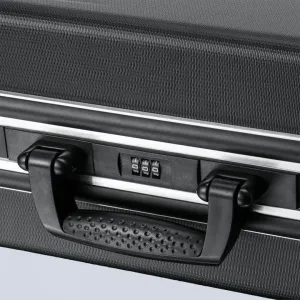 Duas fechaduras metálicas basculantes e fechadura combinada de três dígitos para o fechamento seguro da tampa
