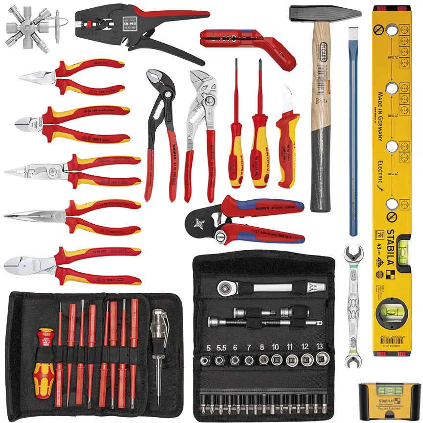 Equipado com 14 ferramentas KNIPEX, um total de 63 ferramentas da marca, parcialmente testadas por VDE de acordo com o DIN EN 60900