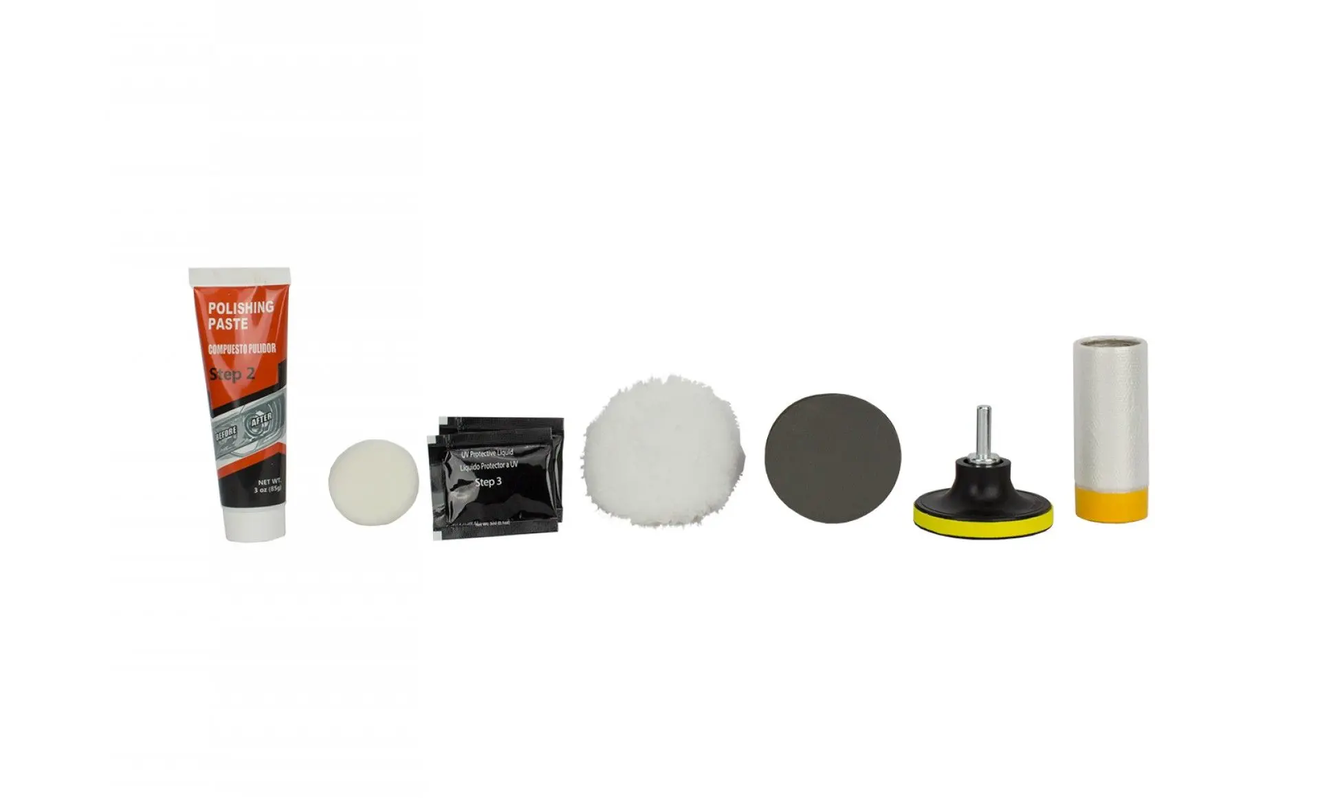 -O KIT incluí um suporte com adaptador que permite o polimento da máquina para restaurar a lente mais nublada