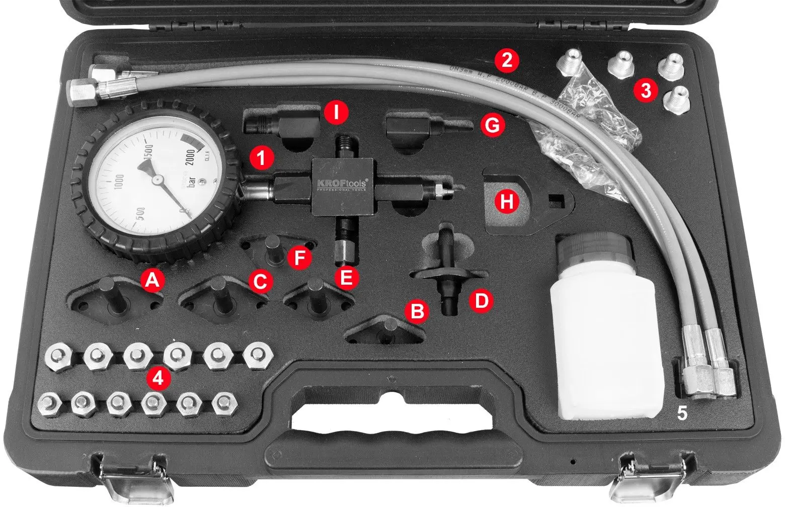 -O teste tem uma válvula de descarga de pressão embutida que limita a pressão máxima a aproximadamente 1500bar para evitar danos no teste ou no veículo