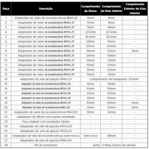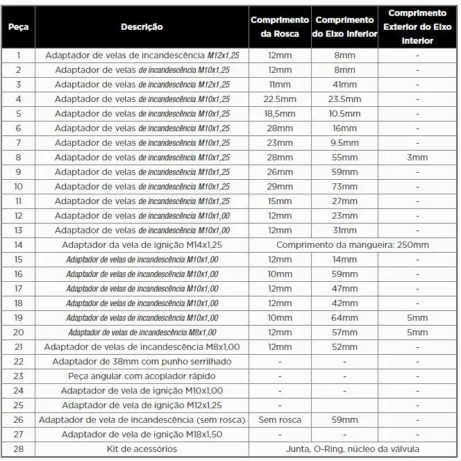 – Inclui adaptadores de rosca para velas de incandescência e velas de ignição