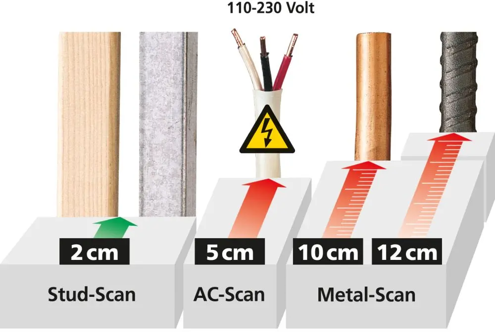 Descrição: Este aparelho eletrónico de localização possibilita a localização específica de metal, de fios sob tensão e fios sem tensão, bem como a localização de vigas e traves. O aparelho é adequado para a utilização em todos os revestimentos não metálicos. Deteta metais escondidos não magnéticos por baixo de pedra, betão, betonilha, madeira, materiais de construção cerâmicos e minerais numa profundidade até 10 centímetros e metais magnéticos até 12 centímetros de profundidade. No modo de metal, o aparelho tem uma indicação de profundidade e informa se é um metal magnético ou não magnético.
