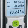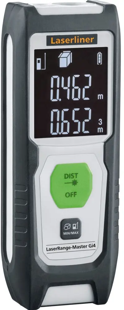 Descrição: O telémetro laser possibilita o cálculo preciso de comprimentos, áreas e volumes, sendo ideal para a determinação de dimensões de espaços e o cálculo de quantidades de material. A visibilidade é excelente devido à tecnologia de laser verde. Durante medições permanentes o visor LC mostra os valores máximo, mínimo e atual. Um visor de fácil leitura, o ponto de referência selecionável da caixa e a construção compacta tornam a aplicação confortável. A caixa revestida com borracha proporciona uma boa proteção. Após fases curtas de inatividade, para poupar energia é primeiro desligado o laser e depois o aparelho.
