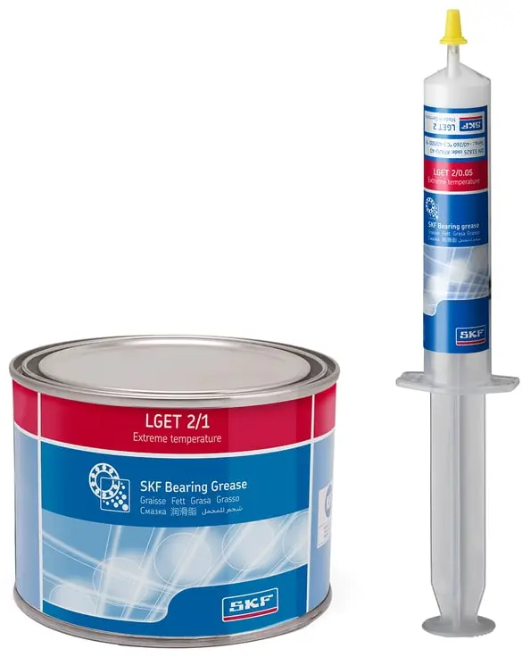 A SKF LGET 2 é uma graxa baseada em óleo fluorado sintético com espessante PTFE. É especialmente adequada para aplicações em temperaturas extremamente altas, de 200 °C (390 °F) até 260 °C (500 °F).