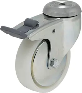Rodízio giratório, com travão(bloqueio simultâneo), suporte em aço estampado com duas pistas de esferas, zincado.