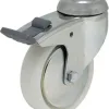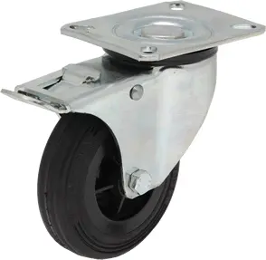 Rodízio giratório, com travão(bloqueio simultâneo), com duas pistas de esferas, suporte em aço estampado, zincado brilhante.