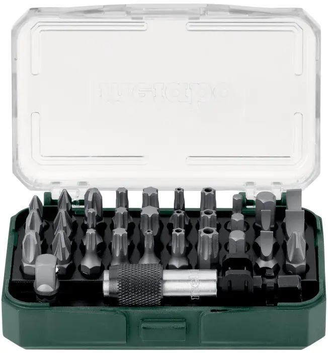 Pontas em aço cromo-vanádio (qualidade S2); porta-pontas magnético; com adaptador para chaves de caixa (adaptador de pontas); caixa robusta de elevada qualidade com design especial Metabo