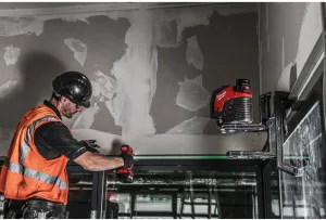 O nível laser de linha cruzada e prumada M12™ proporciona um nivelamento horizontal, alinhamento vertical e transferência de pontos de prumo do chão para o tecto