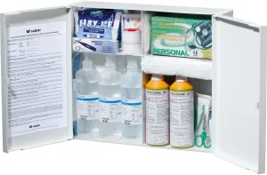 – Conteúdo: 1 tesoura DIN 58279-B190, com pegas de plástico, 5x toalhas não tecidas, 200mm x 300mm, 3 compressas esterilizadas 100 x 100mm, 2 embalagens, 1 bolsa de frio instantâneo auto-activada 150 x 170mm, 1 manta térmica dourada/prateada 2100 x 1600mm, 1 caixa de 4 luvas médicas descartáveis EN455, 1 caixa de pensos de 8 x 60 x 100mm, não-tecidos, 1 caixa com vários pensos adesivos DIN 13157 e DIN 13169 / 20 peças, 1 ligadura esterilizada 600 x 800mm DIN 13152-A, 2 compressas ovais oculares esterilizadas, 50 x 70mm, 2 lenços triangulares brancos DIN 13168, 960 x 960 x 1360mm, 1 embalagem de compressas esterilizadas (grandes) DIN 13151-G, 100 x 120mm, 1 embalagem de compressas esterilizadas (pequenas) DIN 13151-K, 60 x 80mm, 3 embalagens de compressas esterilizadas (pequenas) DIN 13151-M, 80 x 100mm, 2 ligaduras elásticas DIN 61634, 80mm x 4m, 2 ligaduras elásticas DIN 61634, 60mm x 4m, 1 emplastro adesivo, 25mm x 5m com proteção exterior, 2 sacos de plástico auto-vedantes, 300 x 400mm, 1 manual de primeiros socorros em vários idiomas
