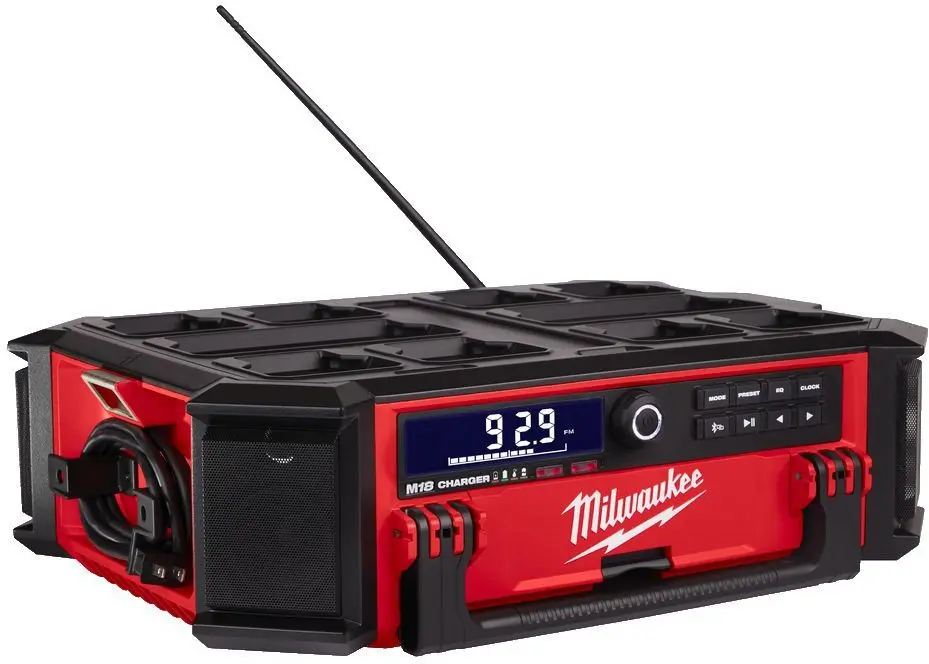 Rádio/carregador de obra M18™ PACKOUT™ com Bluetooth®, saída de altifalante 90W, híbrido AC/DC, carregador USB 2.1A, som 360°, abre-garrafas. Inclui cabo de entrada auxiliar. Fornecido em versão zero, sem baterias nem carregador.