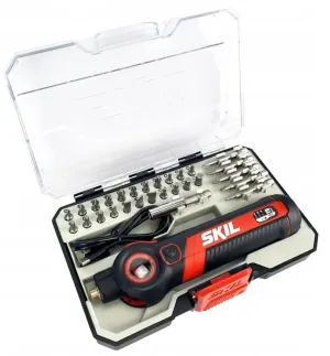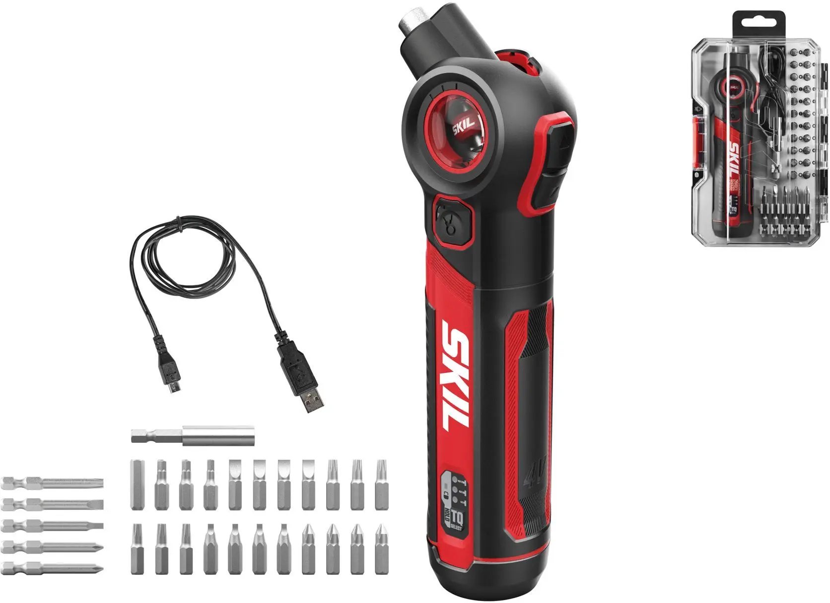 A aparafusadora sem fio SKIL 2714 GA é fornecida numa caixa de armazenamento compacta com um jogo de 22 pontas de aparafusamento de 25 mm, um jogo de 5 pontas de aparafusamento de 50 mm, um porta-pontas magnético e um cabo de carregamento USB-A para USB-C.