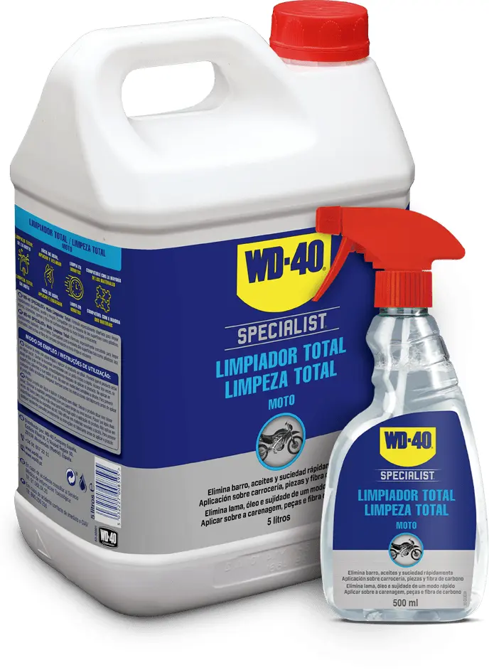 WD-40® Specialist® Moto Limpeza Total é um produto de limpeza geral concebido para eliminar rapidamente a sujidade da moto sem danificá-la.