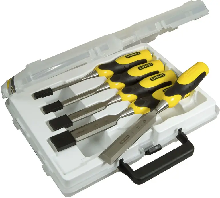 Conjunto de 5 formões com lâmina em liga de aço, retificada e temperada nas todas suas faces. Engraxada para impedir a corrosão. Cabo bimatéria mais grosso. Amortecedor absorvente das pancadas.