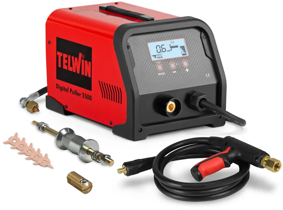 Sistema eletrónico com controlo por microprocessador para reparação de chapas metálicas, adequado para trabalhos em oficinas bate-chapas.