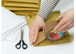 A fita é ideal para pequenos e leves embrulhos e está disponível em castanho ou transparente.
