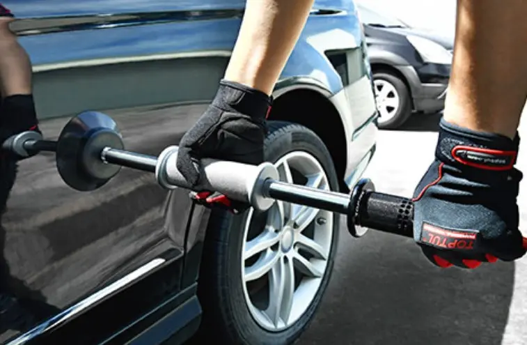 As ventosas seguram o painel e o martelo deslizante retira amassados sem danificar a pintura