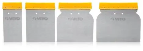 Características: – Fabricado em aço inoxidável; – Pega em plástico; – Contém 4 betumadeiras; – Medidas: 50, 80, 100 e 120 mm.