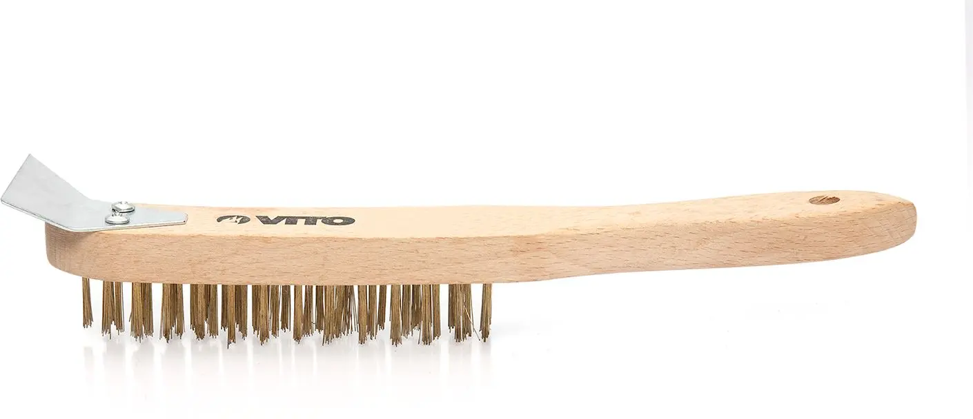 Características: – Cerdas de aço latonado – 2,2 cm; – Cabo de madeira; – Meadas: 5 x 13 – 28 fios cada.