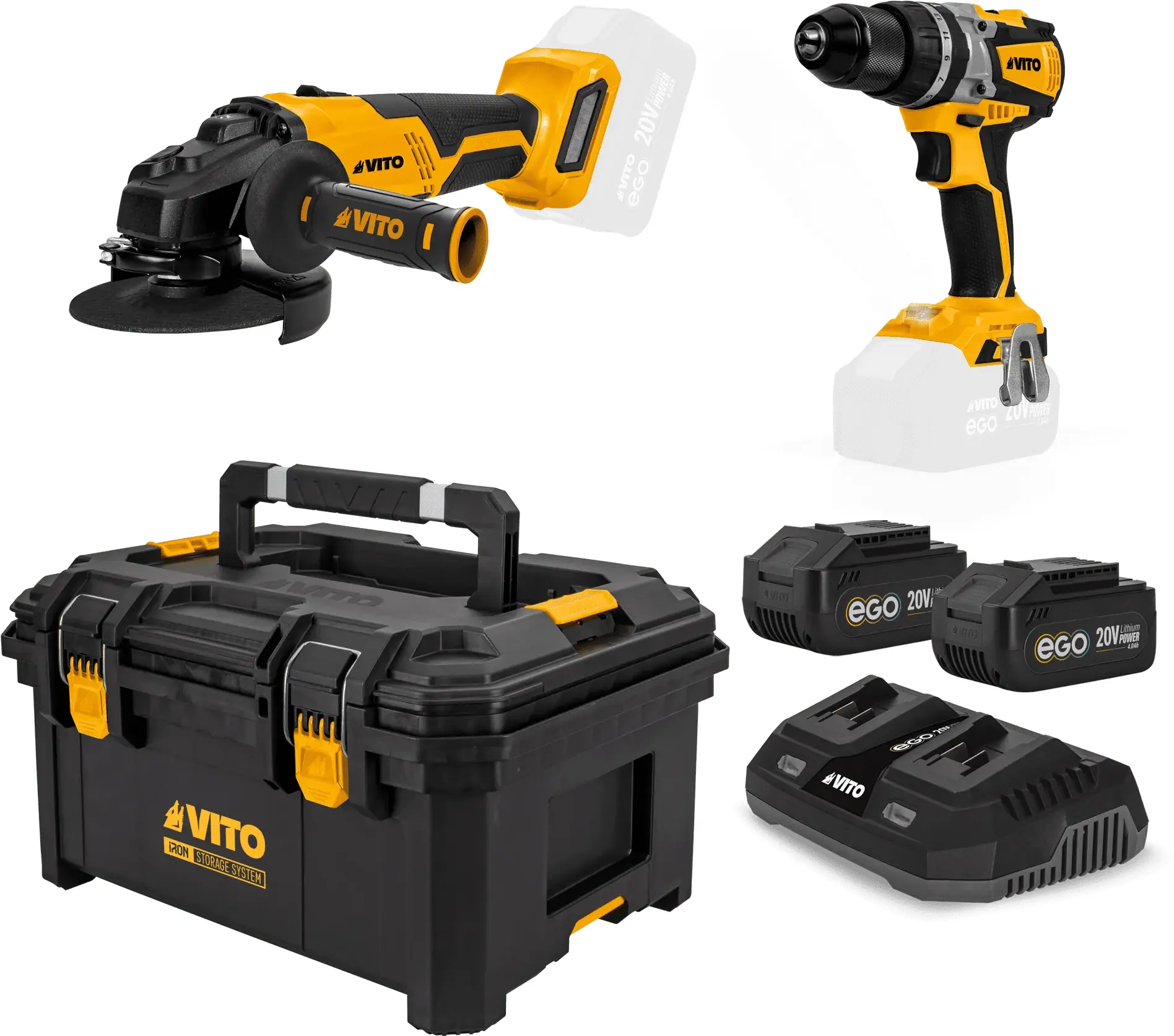 Este PACK da VITO (PACK1EGOIRON) inclui um Berbequim Brushless 20V, uma Rebarbadora Brushless 20V – 115MM, duas baterias 20V EGO de 4Ah, um carregador duplo rápido 20V e uma mala modular média.
