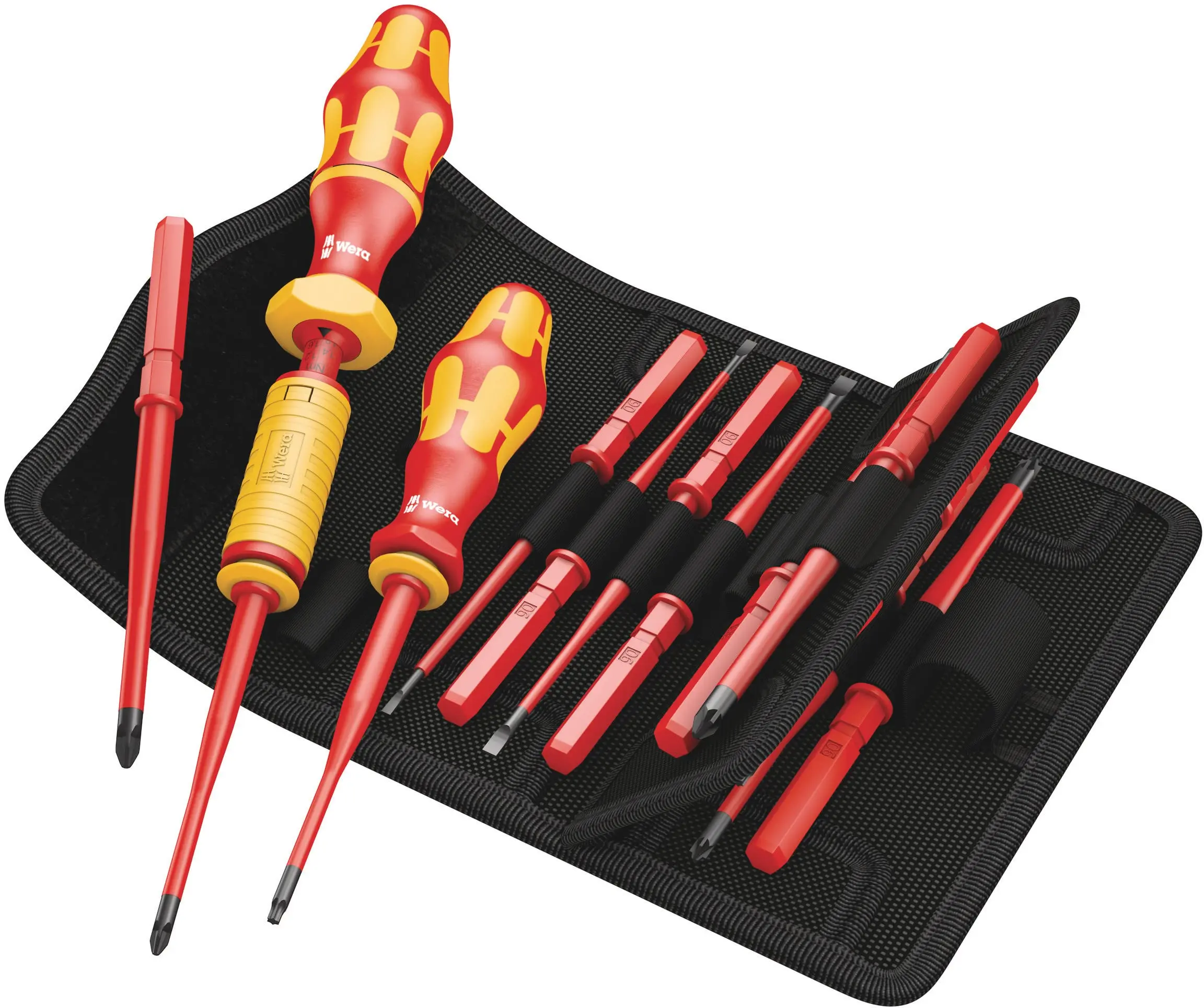 Conjunto de lâminas intercambiáveis ??VDE de torque de 16 peças. Inclui 14 lâminas (11 das quais de diâmetro reduzido) com proteção de isolamento integrada. Suporte VDE de torque com torque ajustável de 1,2-3,0 Nm e suporte VDE 817 VDE. Cabo Kraftform Plus: zonas de aderência rígidas para altas velocidades de trabalho, enquanto zonas suaves garantem alta transferência de torque.