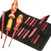 16 lâminas intercambiáveis VDE com cabo Kraftform 817 VDE e testador de fase unipolar em uma bolsa robusta para cinto. Ferramentas testadas individualmente conforme IEC 60900. Teste individual a 10.000 volts para trabalho seguro na tensão permitida de 1.000 volts.