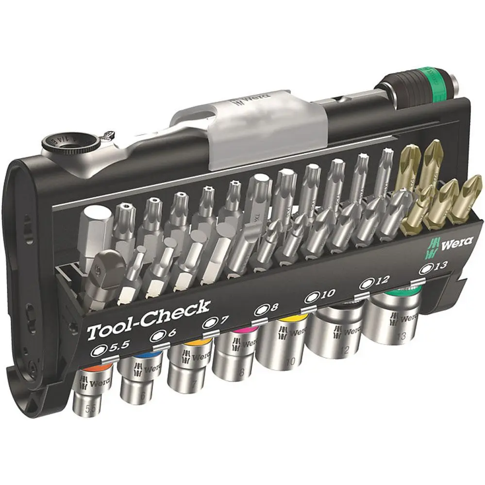 Catraca, bits e soquetes em um espaço mínimo – o mais compacto possível. Operação simples, mesmo com apenas uma mão, em espaços de trabalho confinados. Design forjado, totalmente em aço e mecanismo de passo fino com 60 dentes que permite um pequeno ângulo de retorno de 6° para um trabalho preciso. Fácil troca esquerda/direita. Cabeça de catraca e alavanca ergonomicamente projetadas. Adequado para coleta de bits e soquetes de ¼”. O uso de soquetes de ¼” também é possível com o adaptador Wera 870/1. Bits viscosos resistentes para uso universal. O inserto de soquete para ferramentas manuais e elétricas (ISO 2725-Parte 3) da Wera permite aplicações tanto em ferramentas manuais quanto elétricas. Localizador de ferramentas “Take it easy” com codificação de cores de acordo com o tamanho – para acesso simples e rápido à ferramenta necessária. Apresentando uma boa pegada para permitir fácil coleta mesmo com mãos oleosas. Ranhura de parada de esfera, para parafusos e porcas sextavados; aço cromo vanádio, cromado fosco.